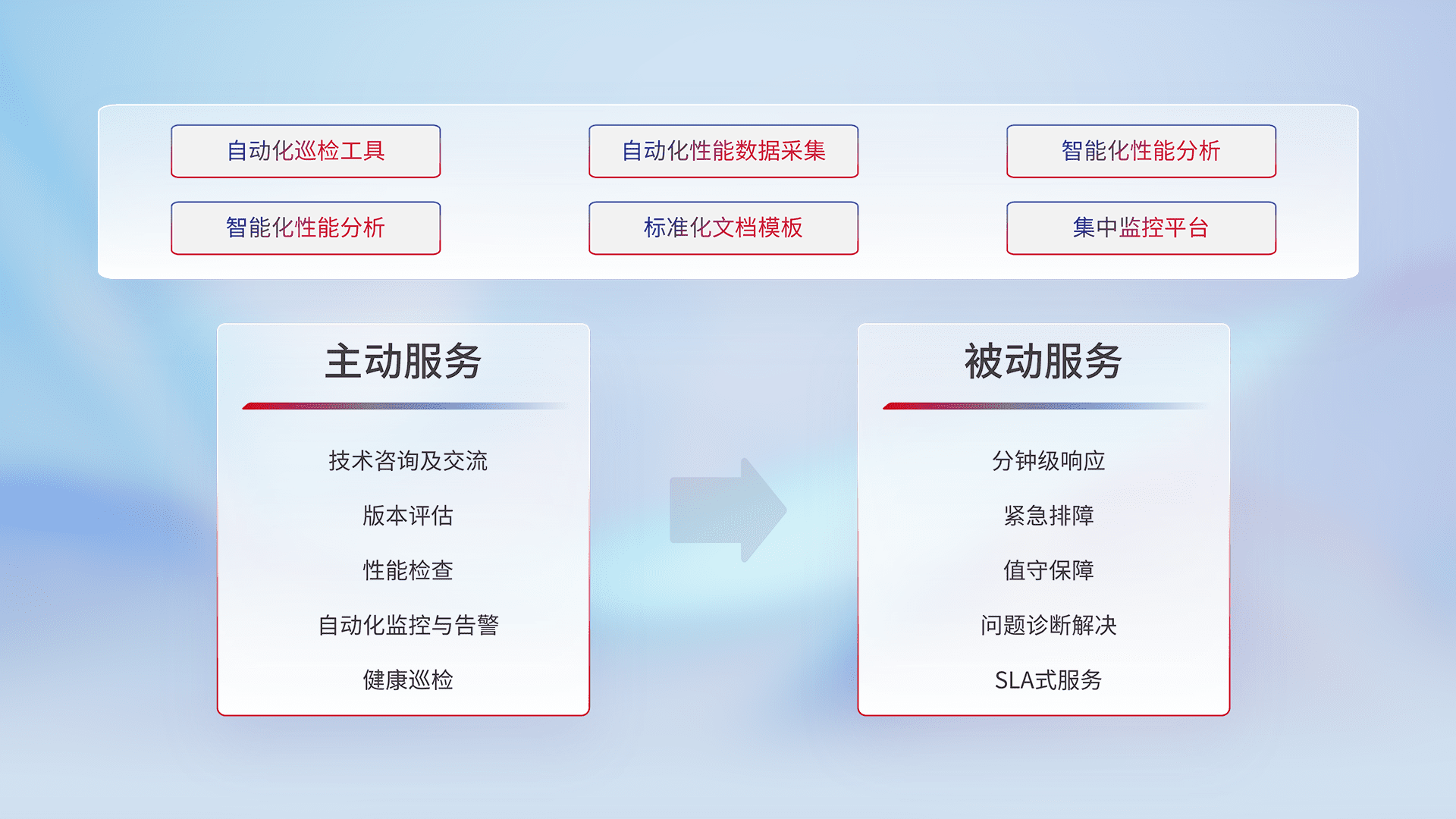 智能化工具和标准化文档,,保障服务质量,,,提供主动服务(包含技术咨询、、、、版本评估、、性能检查、、、、自动化监控与告警、、、、健康巡检)和被动服务包含(分钟级响应、、、紧急排障、、、、值守保障、、、、问题诊断解决、、SLA服务)。。